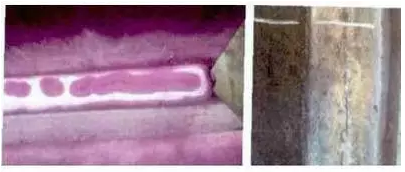某體育場(chǎng)鋼結(jié)構(gòu)支座出現(xiàn)熱裂紋,如圖5所示。因焊劑不合格,鋼結(jié)構(gòu)制作焊接時(shí)出現(xiàn)大面積熱裂紋,如圖6所示。